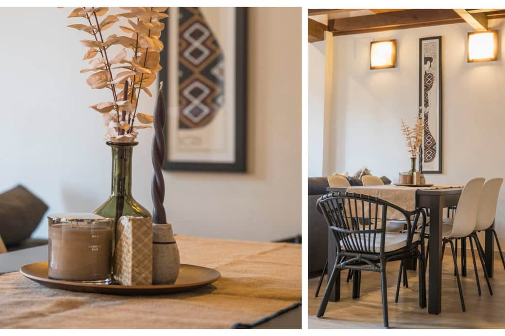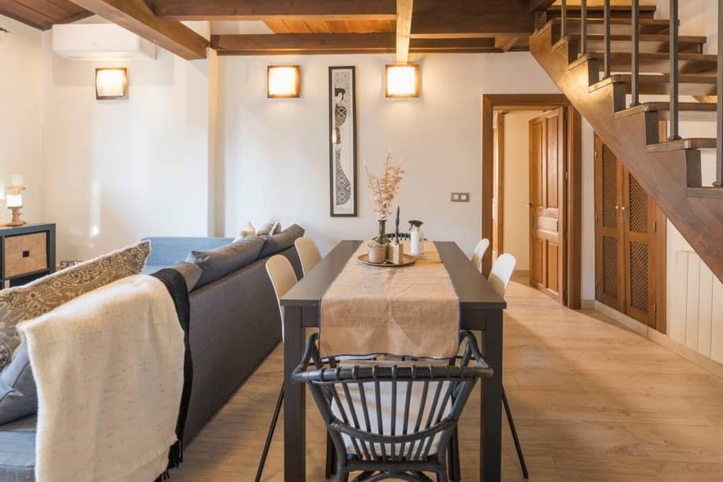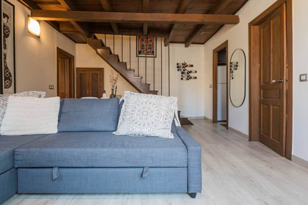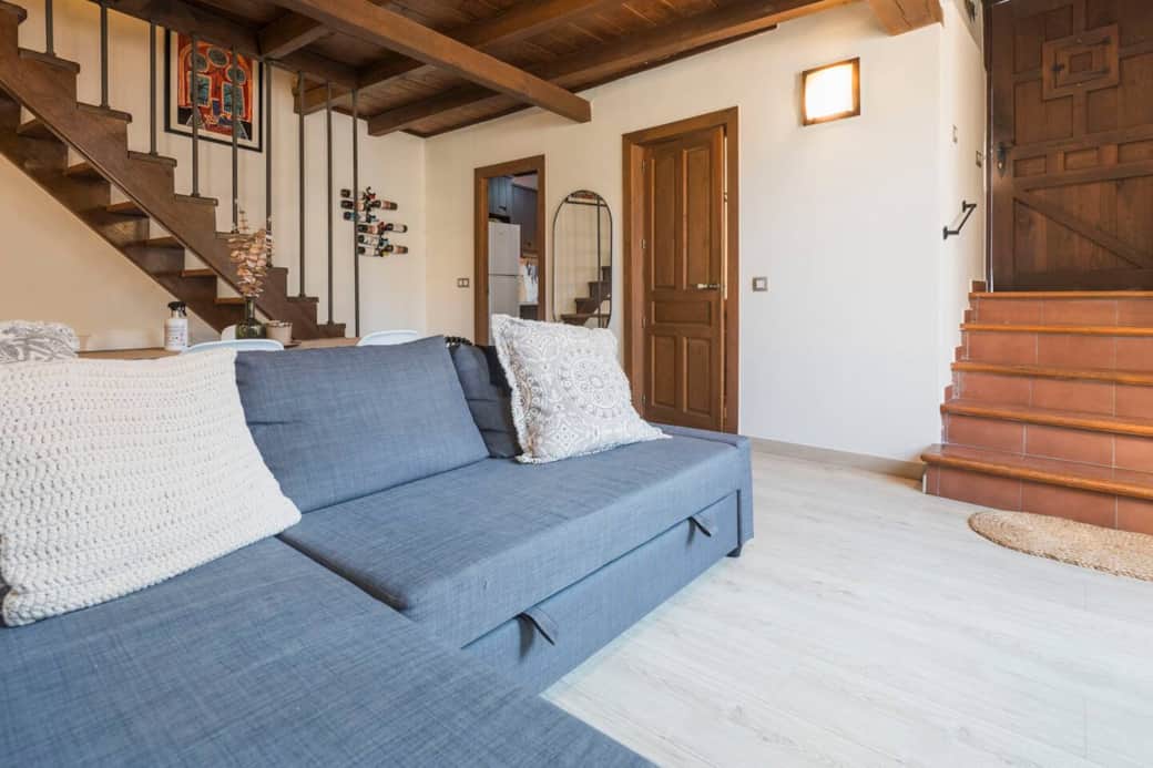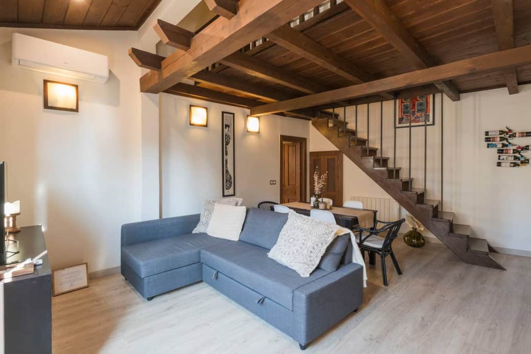 Modern accommodation for up to 5 people in the heart of Toledo's Jewish quarter. The duplex apartment features a spacious living room with a separate kitchen, bathroom, and one bedroom on the first floor. Upstairs, there's another space with another single sofa bed, a full bathroom with shower, and another trundle bed. The apartment features Wi-Fi, a TV, air conditioning, and a television. Surrounded by Toledo's main tourist attractions (the Cathedral, the Jewish quarter, the Alcazar, etc.)