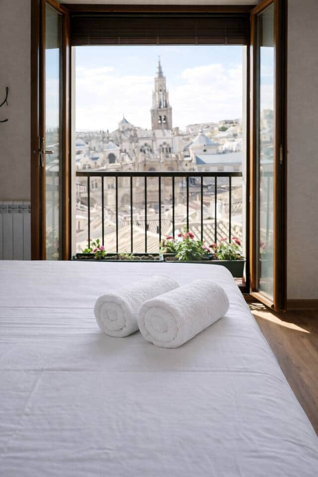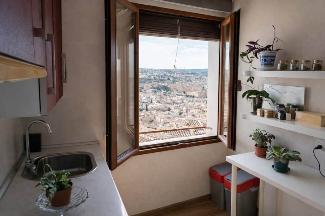 El apartamento está muy céntrico, justo al lado del Alcázar, a 2 min de la plaza de Zocodover, a 5 min de la Catedral y a 10 min del barrio judío. El apartamento es muy luminoso y con unas vistas expectaculares, como se aprecia en las fotos.