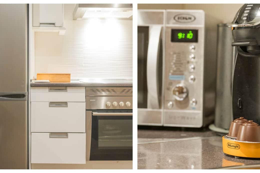 Cozinha totalmente equipada: placa vitrocerâmica, micro-ondas, torradeira, forno, máquina de lavar loiça, chaleira elétrica (kettle), frigideiras, panelas, etc.